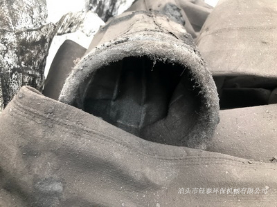 除塵器使用地點(diǎn):寧夏石嘴山,除塵濾袋使用壽命:3年,除塵濾袋規(guī)格:500g滌綸針刺氈,粉塵類型:黑砂,粉塵特性:粗粉塵、濕度大,干燥時(shí)會變成固體并粉碎,工作溫度:低于60℃除塵器吸風(fēng)口處有一個(gè)除塵濾袋在袋口損壞,濾布完全成了黑色,由于缺少一個(gè)濾袋